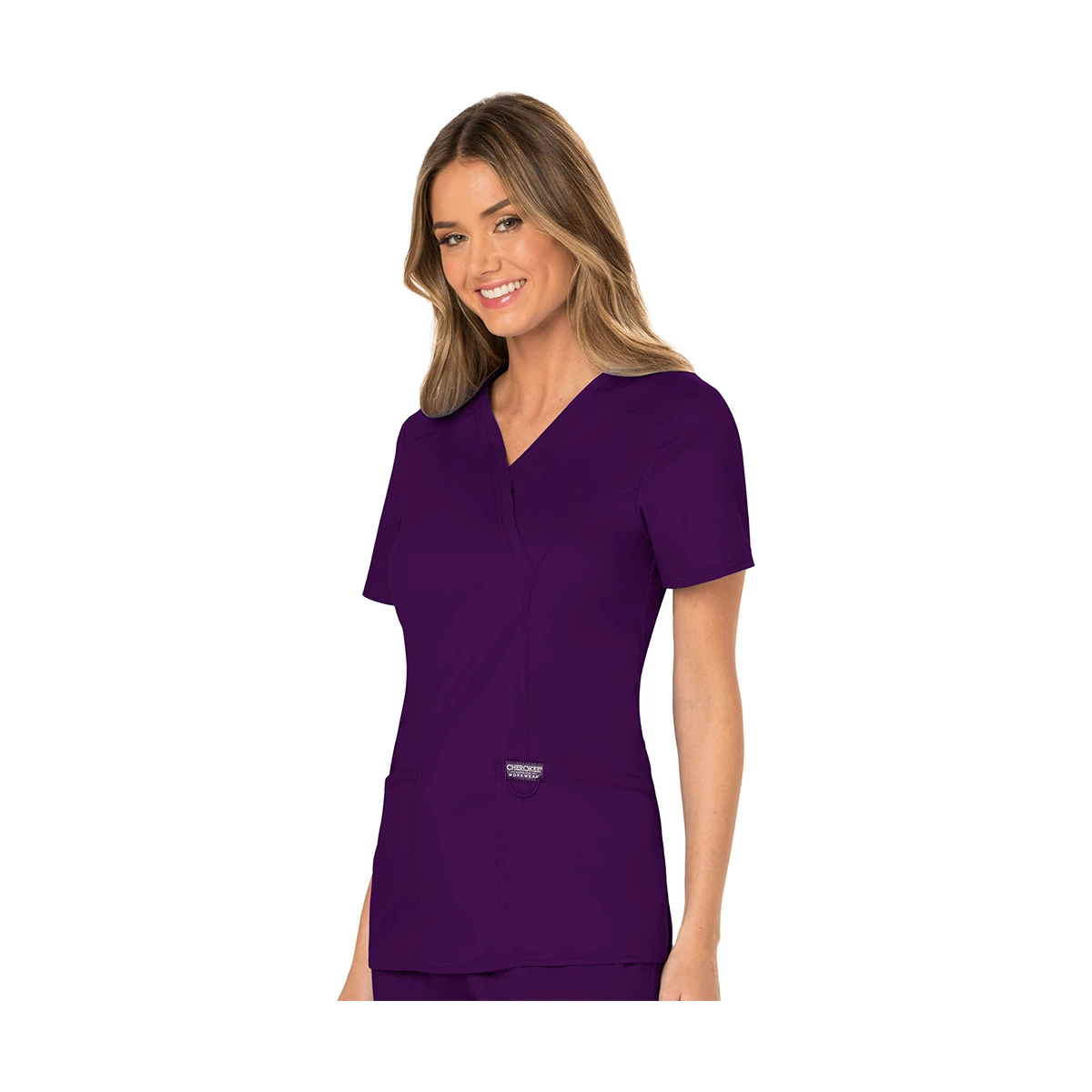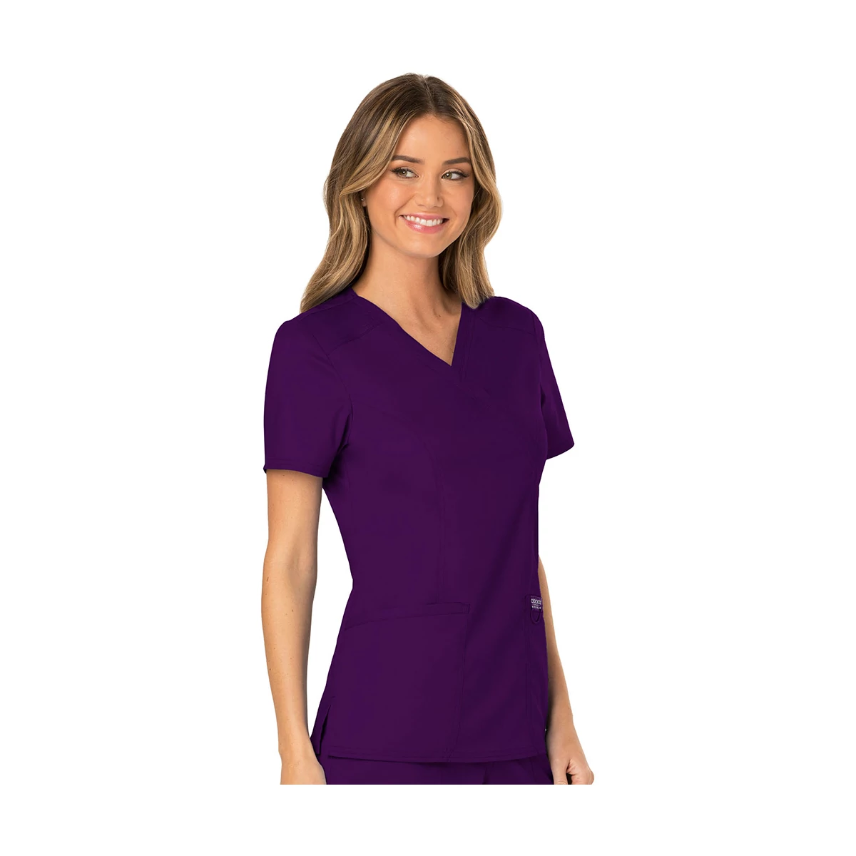 Munkaruha - Modern klasszikus fazonú rövid ujjú, V-nyakú női felső. Elől két nagy tároló zsebbel, műszertartó hurkokkal. Hátközép hossz: 66 cm. Összetétel: 78% poliészter, 20% rayon, 2% spandex